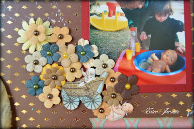 As I am on a bit of a "rampage" to finish WIP's and use up what I have, I went right there into the archives again for these papers... I remembered that I had some "old" doggy papers from a layout I did in a class about 10 years ago... These papers are very thin and tears easily, so I had to be quite careful. The paw brads were also in my stash for many years and the same with the 7 Gypsies stickers...